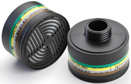 * ABEK2 DIN menetes szűrőbetétek a 20401 Panarea (GAN22100) teljesálarchoz és 6EUR100 Eurmask DIN (GAN22105) félálarchoz. * A2: 65 °C fölötti forráspontú szerves gázok, gőzök ellen* B2: Szervetlen gázok és gőzök ellen, kivéve a CO-t* E2: Szerves savak, savas gázok* K2: Ammónia és szerves származékai, és szerves amin származékok ellen* A szűrőbetét teste HDPE-ből, a szűrőanyag aktív szénből és nemszőtt PP-ből készült, amelyet gomba és baktérium ellen védő szerrel kezeltek.