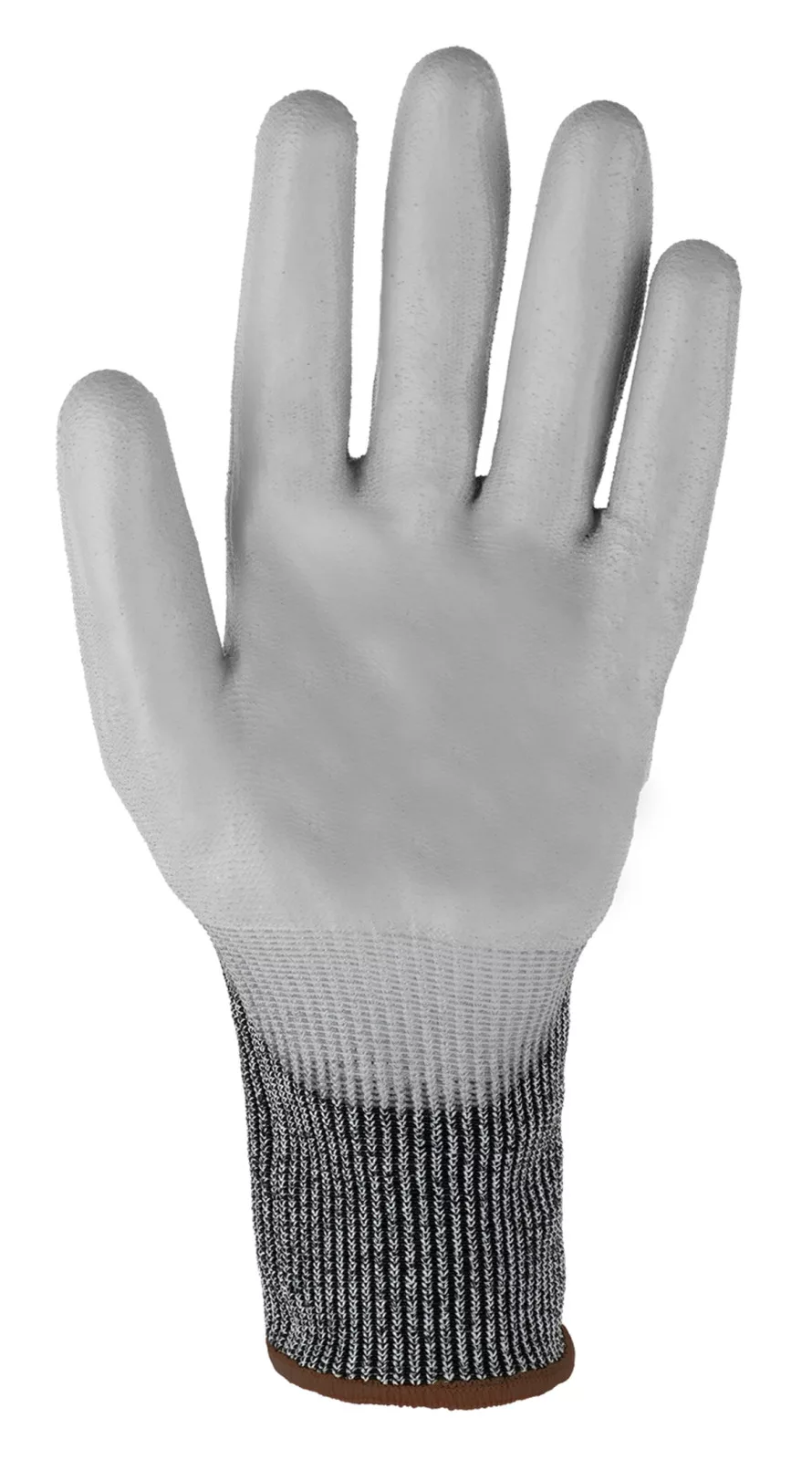 13-as kötésű szürke, varrás nélküli HPPE, acélszál, spandex, PES alapanyagú kesztyű Tenyerén szürke poliuretán tenyérbevonattalKötött mandzsetta.