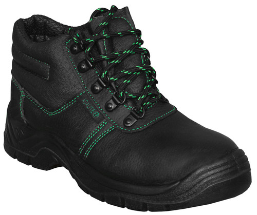 * biztonsági védőlábbeli bőrből, acél lábujjvédővel* olajálló, antisztatikus, kétrétegű PU talp, emelt szintű SRC csúszásbiztosság * szivacsos bokarész és –békanyelv * talplemez nélküli, lábujjvédős bakancs változat zöld színű varrással
