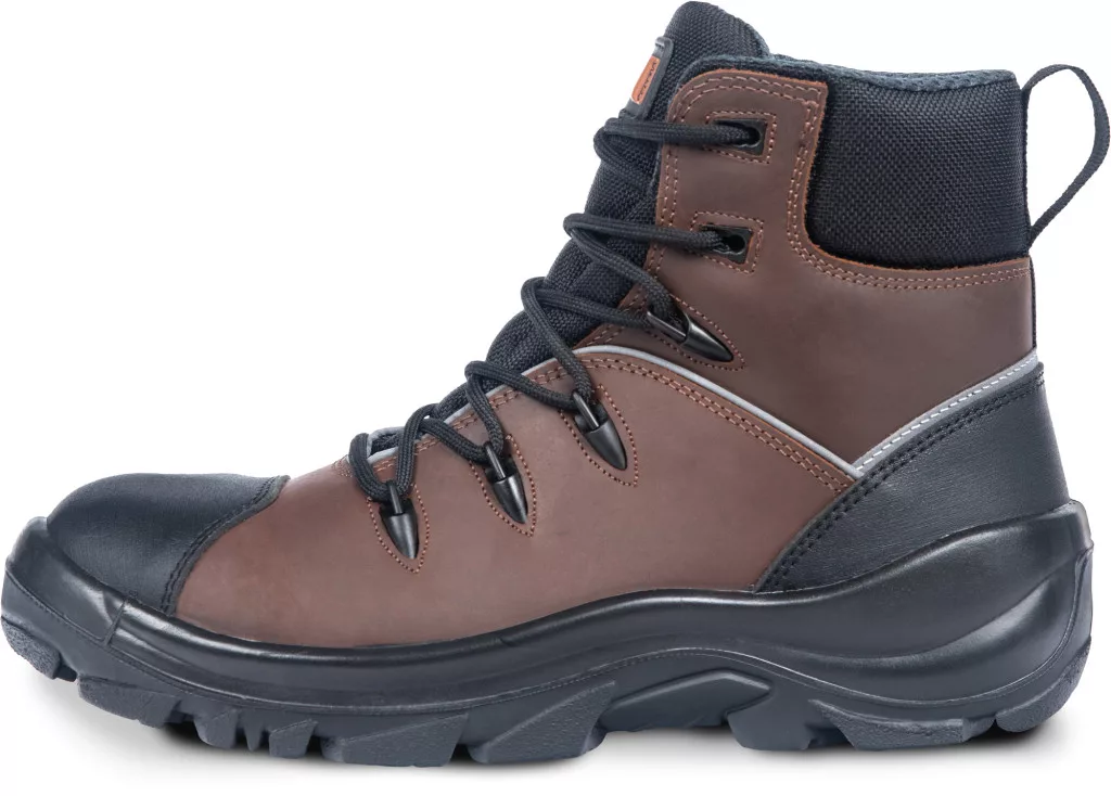 A felsőrész teljes értékű marhabőrből készül, amely kopásálló és tartós. A kétrétegű (PU/Vibram gumi) talp nemcsak kényelmes viselést biztosít, hanem kiemelkedő csúszásgátló tulajdonságot és stabilitást nyújt egyenetlen vagy instabil felületeken is. A talp olajálló, valamint ellenáll a 300 °C-ig terjedő hőhatásnak.