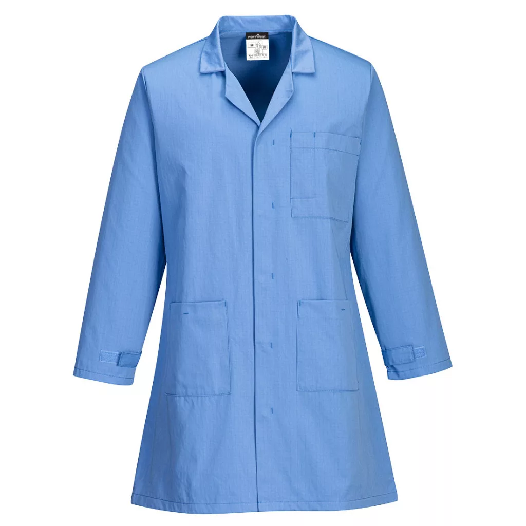 This inherently anti-static coat is ideal for environments where electrostatic resistance is required. Designed with safety and comfort in mind. Features include concealed stud front, two lower patch pockets, one chest pockets and adjustable cuffs.