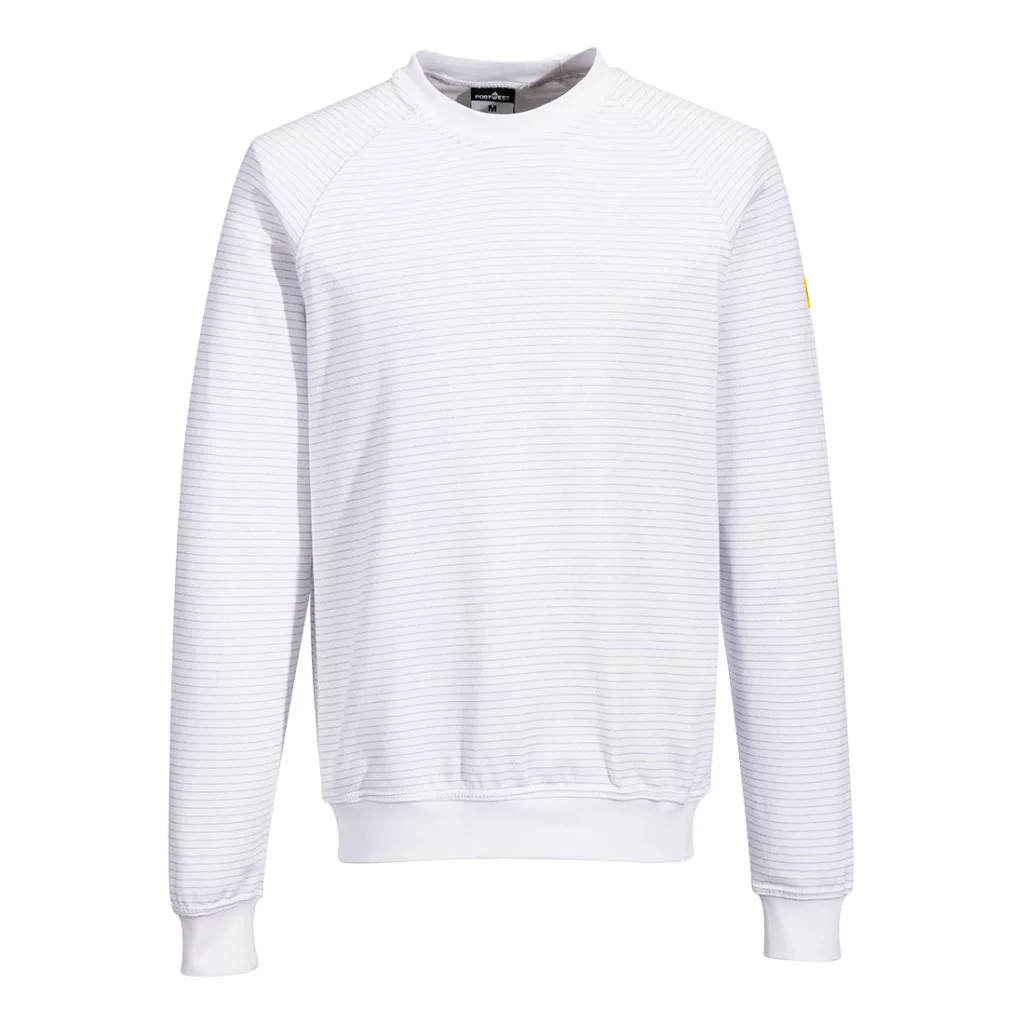 This Anti-Static ESD sweatshirt is breathable, warm and comfortable. It is ideal for EPA areas and environments where electrostatic resistance is required. The raglan sleeve allows greater freedom of movement, whilst carbon fibre woven throughout the fabric and rib provides fantastic antistatic protection. Available in a large variety of sizes and colours.