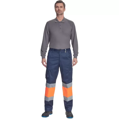• férfi munkanadrág 7 cm széles fényvisszavető csíkokkal és Hi-Vis elemekkel • 2 első zseb + 1 érmezseb • 2 oldalzseb • 2 hátsó zseb • rugalmas oldalsó betétek a derékpánton • leengedhető szárak