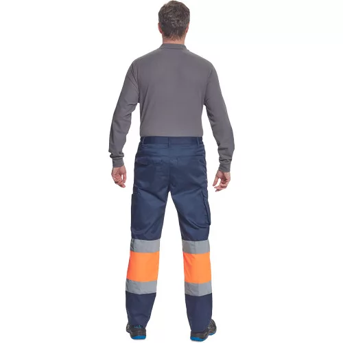 • férfi munkanadrág 7 cm széles fényvisszavető csíkokkal és Hi-Vis elemekkel • 2 első zseb + 1 érmezseb • 2 oldalzseb • 2 hátsó zseb • rugalmas oldalsó betétek a derékpánton • leengedhető szárak