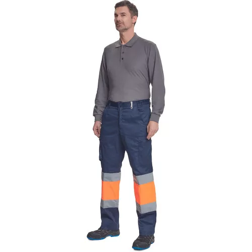 • férfi munkanadrág 7 cm széles fényvisszavető csíkokkal és Hi-Vis elemekkel • 2 első zseb + 1 érmezseb • 2 oldalzseb • 2 hátsó zseb • rugalmas oldalsó betétek a derékpánton • leengedhető szárak