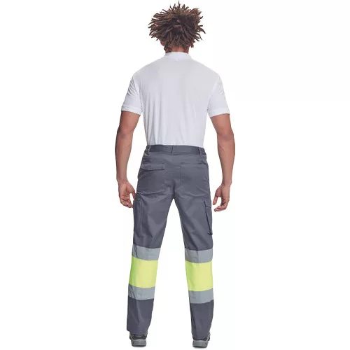 • férfi munkanadrág 7 cm széles fényvisszavető csíkokkal és Hi-Vis elemekkel • 2 első zseb + 1 érmezseb • 2 oldalzseb • 2 hátsó zseb • rugalmas oldalsó betétek a derékpánton • leengedhető szárak