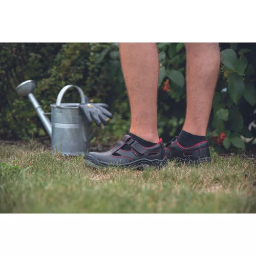 » S1P biztonsági szandál acél átszúrás ellen védő köztalppal és acél lábujjvédővel » csúszásgátló, az antisztatikus, dupla sűrűségű PU külső talp, ellenáll az olajokkal és kopással szemben » bőr felsőrész, lélegző PES bélés » tépőzáras záródás