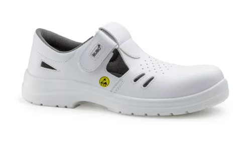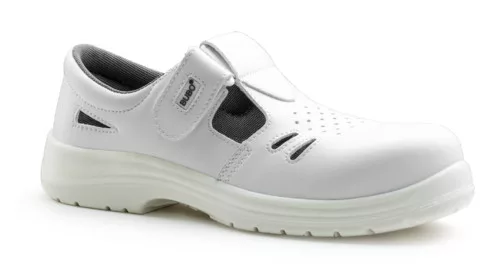 * fémmentes tépőzáras szandál kompozit lábujjvédővel, folyadékoknak jobban ellenálló, kiválóan szellőző fehér mikroszálas felsőrésszel * antisztatikus, olajálló, hajlékony, kétrétegű, fehér PU talp, ütődéselnyelő sarokkal * nedves acél és kerámiafelületekre bevizsgált, SRC fokú csúszás elleni védelem, kényelmes talpbélés * könnyű súlyú, egészségügyi, élelmiszeripari munkákhoz, egésznapos viseletre ajánlott védőlábbeli szivaccsal párnázott bokarésszel, szellőzőnyílásokkal