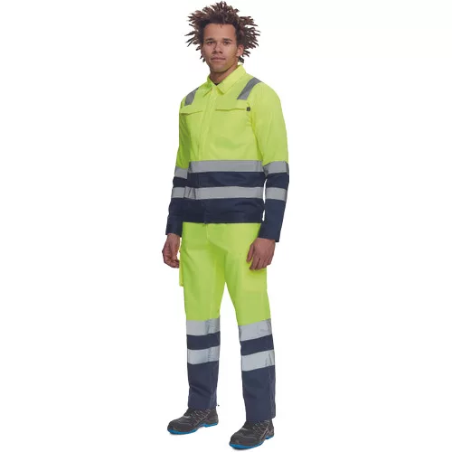 • férfi Hi-Vis munkanadrág 7 cm széles fényvisszavető csíkokkal • 2 első zseb + 1 érmezseb • 2 oldalzseb • 2 hátsó zseb • rugalmas oldalsó betétek a derékpánton • leengedhető szárak