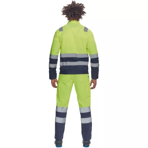 • férfi Hi-Vis munkanadrág 7 cm széles fényvisszavető csíkokkal • 2 első zseb + 1 érmezseb • 2 oldalzseb • 2 hátsó zseb • rugalmas oldalsó betétek a derékpánton • leengedhető szárak