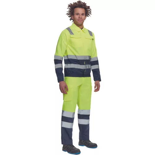 • férfi Hi-Vis munkanadrág 7 cm széles fényvisszavető csíkokkal • 2 első zseb + 1 érmezseb • 2 oldalzseb • 2 hátsó zseb • rugalmas oldalsó betétek a derékpánton • leengedhető szárak