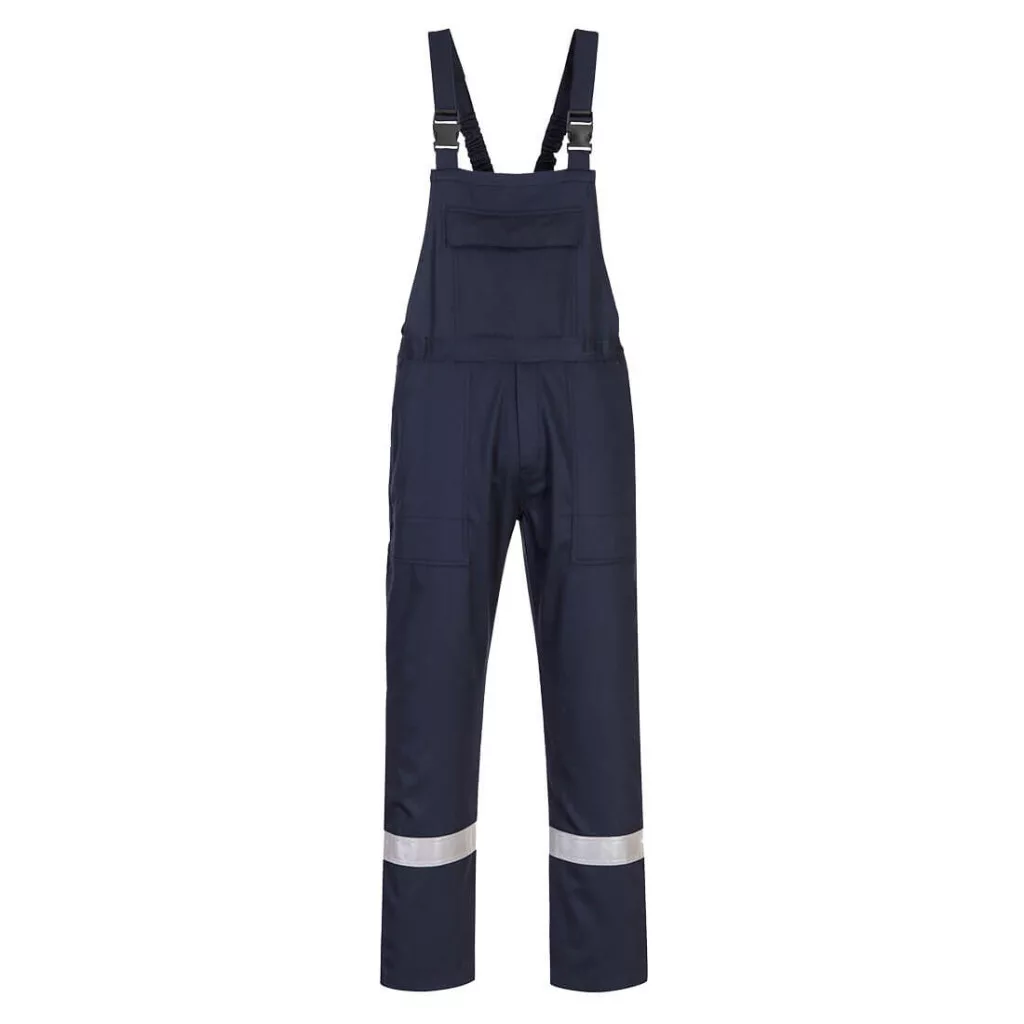 Offering complete lower body and chest protection, the Bizweld FR Bib and Brace has been designed with the safety and protection of the wearer in mind. It has been constructed with a large chest flap pocket in the front for carrying tools or personal belongings and also boasts two side pockets, a back hip pocket with flap, a rule pocket and reflective tape at leg ends. The adjustable elasticated straps offer maximum comfort and a perfect fit.