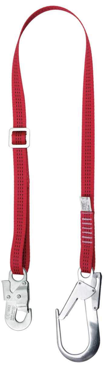* 32 mm széles hevederszalag, fekete jelzőszállal * 2 m-es, fémcsattal állítható hosszúságú poliamid * hurkolt végein 18 és 50 mm nyílású karabiner kettős rugós acélzárral