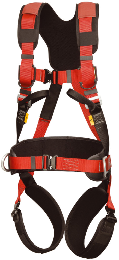 * állítható váll-, combhevederek, teljes biztonsági mellheveder 45 mm széles poliamidból* két mellső hevederhurkos, egy hátsó alu fémgyűrűs felfüggesztési pont* munkahelyzet-beállító deréköv állítható méretben, két fémgyűrűs bekötési ponttal* lapocka és mellrész közti széles szivacsbetét, gyorscsatos záródás a vastag, biztonsági mellhevedernél, valamint a hasnál és comboknál is