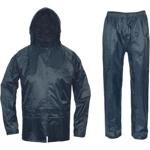 Kétrészes esővédő öltöny csuklyával, lehegesztett varratokkal, praktikus tartóban.