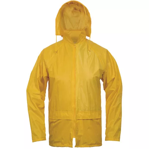 Kétrészes esővédő öltöny csuklyával, lehegesztett varratokkal, praktikus tartóban.