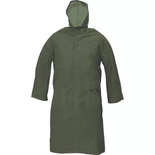 • hosszított, vízálló esőkabát kapucnival • lehegesztett varratokkal • PVC bevonatú poliészterből • 2 mély zsebfedős oldalzseb • belső gumírozott mandzsetta • szellőzőbetétek a háton és a hónaljrészen