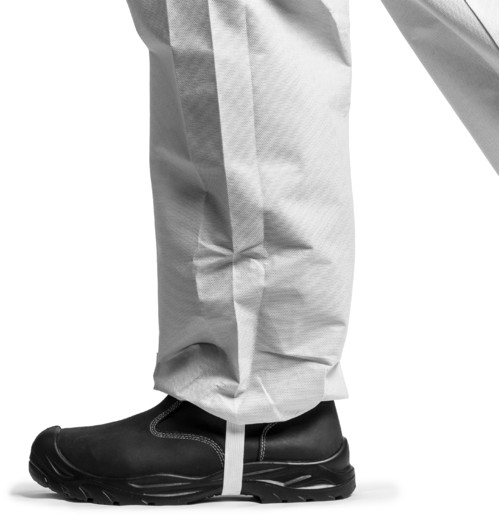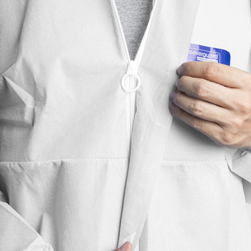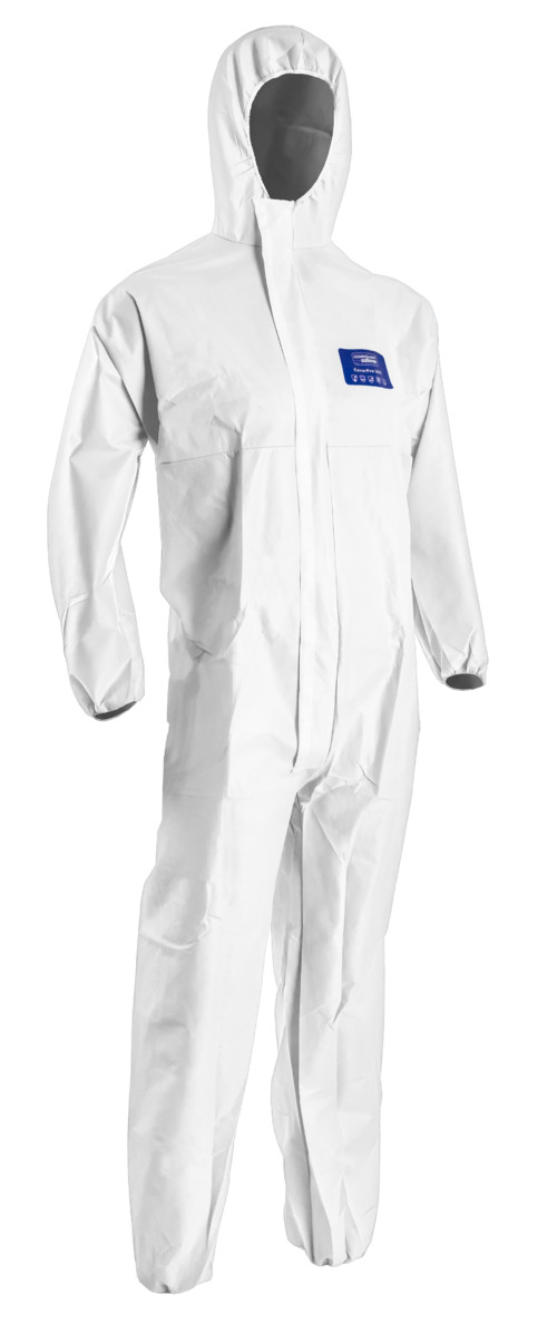* CoverPro 5S10 fehér színű, három rétegű, kapucnis könnyű (50 g/m2) antisztatikus, SMS polipropilén overáé* porok, folyadékpermetek, fröccsenő vegyszerek, továbbá radioaktív szennyeződésű részecskék elleni védelem* gumizott derék-, arc-, csukló- és bokarész, védőhajtókával ellátott cipzár* III. védelmi kategória, 5. és 6. típus