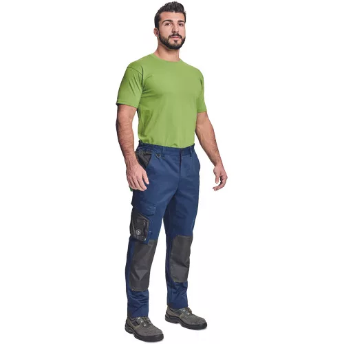 • munkanadrág pamutgazdag anyagból • modern szabással • megerősített térdrész térdvédőtartó zsebbel • 2 zseb elöl • 1 többfunkciós zseb • tépőzáras hátsó zseb • rugalmas derék • D-gyűrű • leengedhető szárak