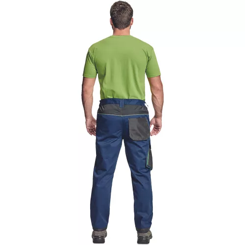 • munkanadrág pamutgazdag anyagból • modern szabással • megerősített térdrész térdvédőtartó zsebbel • 2 zseb elöl • 1 többfunkciós zseb • tépőzáras hátsó zseb • rugalmas derék • D-gyűrű • leengedhető szárak