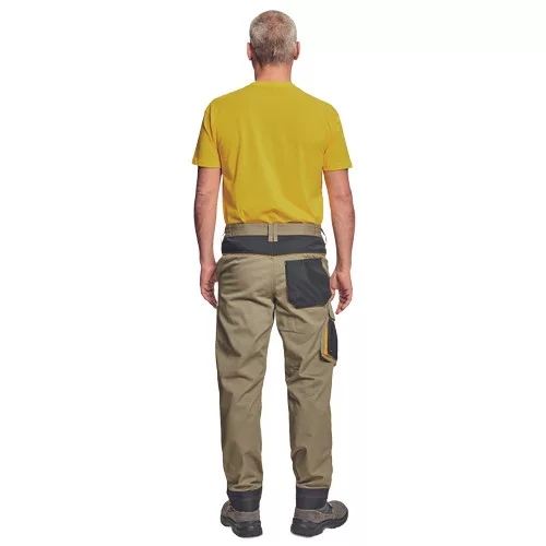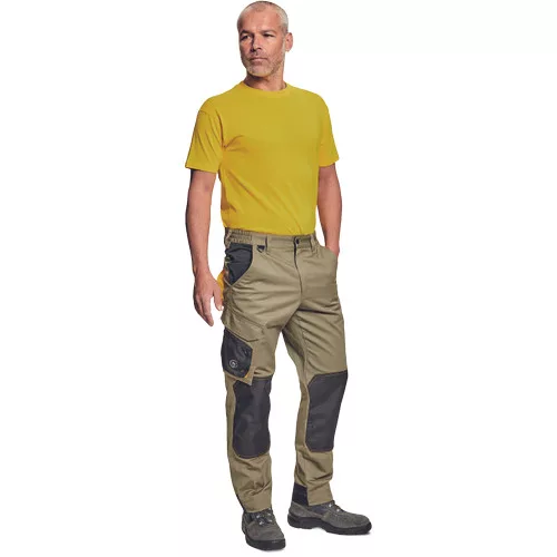 • munkanadrág pamutgazdag anyagból • modern szabással • megerősített térdrész térdvédőtartó zsebbel • 2 zseb elöl • 1 többfunkciós zseb • tépőzáras hátsó zseb • rugalmas derék • D-gyűrű • leengedhető szárak