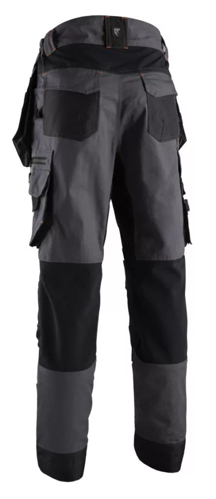 Ripstop: 60% pamut / 40% PES - 280 g/m2 + poliamid / sztreccs betétek + Oxford poliamid/sztreccs - 300D - sötétszürke/narancsMagasított derék10 zseb 2 szerszámtartó hurok Sztreccs betétek: térd felett + térd mögött Oxford sztreccs alapanyagú térdvédő zsebek kontrasztos színek YKK cipzár a sliccen Láthatósági díszcsíkok tripla biztonsági varrás A száron még 5 cm-es lehajtási lehetőségRegular fit EN 14404: Type 2