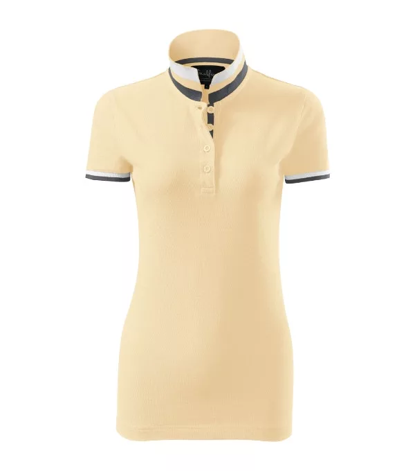 a felhajtható gallér alsó felülete és az ujjak szegélye kontraszt színű csíkokkal
