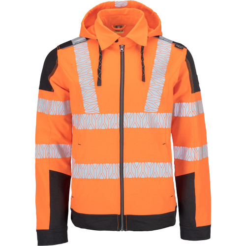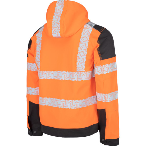 • jólláthatósági (HV) 4 irányban rugalmas poliészter szövet • szegmentált fényvisszaverő csíkok • számos praktikus zseb oldalt és elöl • levehető kapucni • textilerősítés vállrészen