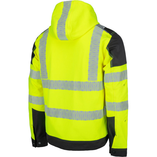 • jólláthatósági (HV) 4 irányban rugalmas poliészter szövet • szegmentált fényvisszaverő csíkok • számos praktikus zseb oldalt és elöl • levehető kapucni • textilerősítés vállrészen