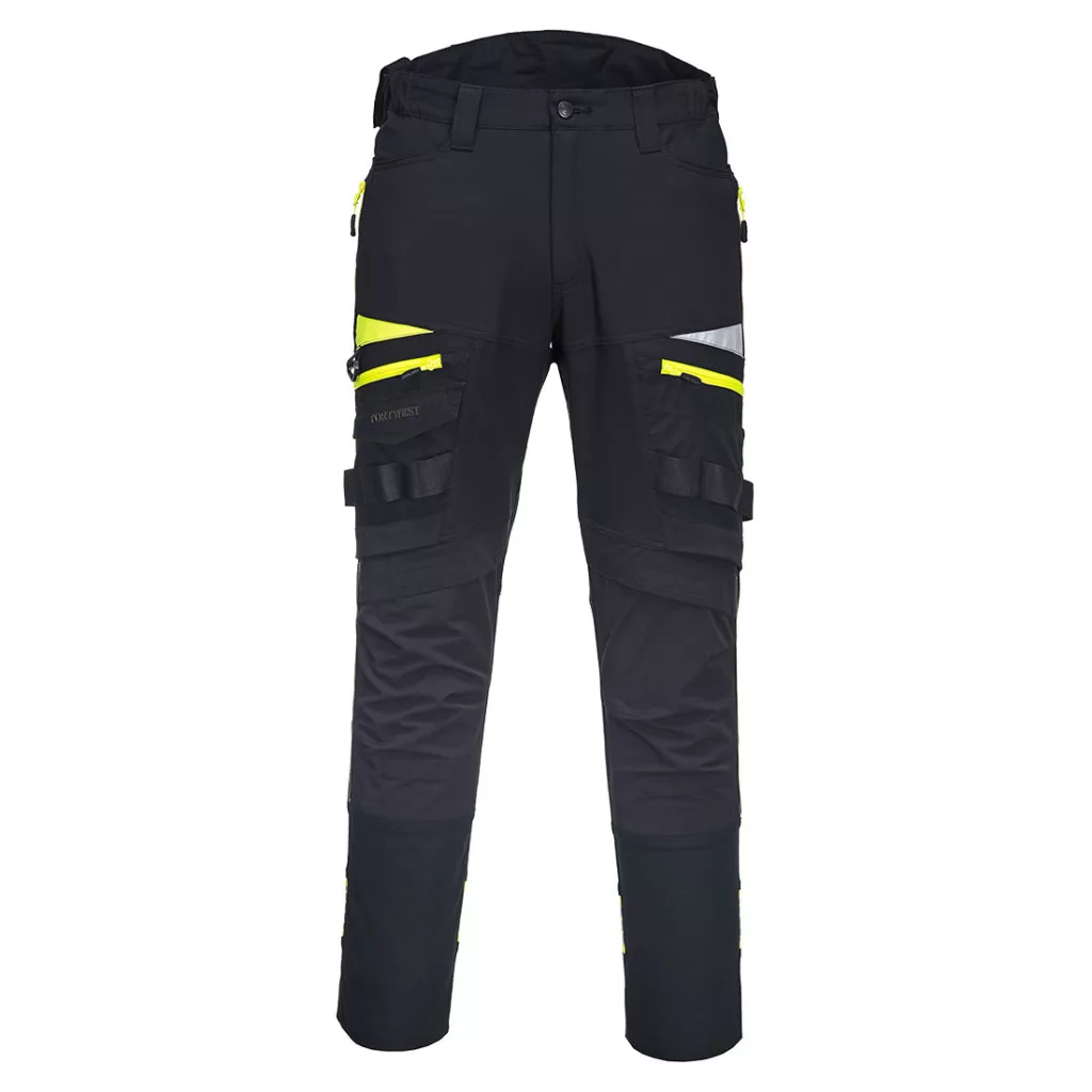 The DX4 Work Trouser is ergonomically designed and uses the targeted placement of dynamic 4X stretch fabrics to give maximum range of movement when working. The trouser features a high-rise back waistband with side elastication, ensuring protection in all working positions. Pre-bent top loading adjustable knee pad pockets, generously sized front pockets and multi-functional zip thigh pockets offers secure storage of phone, pens and tools. Triple stitching throughout for maximum durability.