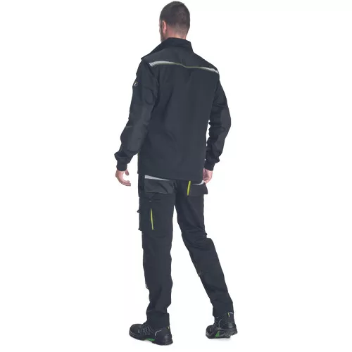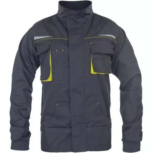 • férfi munkakabát, rendkívül tartós rugalmas anyagból • elöl cipzárral, védőfedéllel • 2 oldalzseb • 2 mellzseb, az egyik mobiltartó zsebbel • Oxford 600D megerősített váll- és könyökrészek • fényvisszavető elemek • kötött, elasztikus ujj mandzsetta