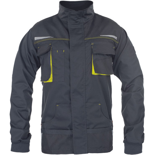 • férfi munkakabát, rendkívül tartós rugalmas anyagból • elöl cipzárral, védőfedéllel • 2 oldalzseb • 2 mellzseb, az egyik mobiltartó zsebbel • Oxford 600D megerősített váll- és könyökrészek • fényvisszavető elemek • kötött, elasztikus ujj mandzsetta