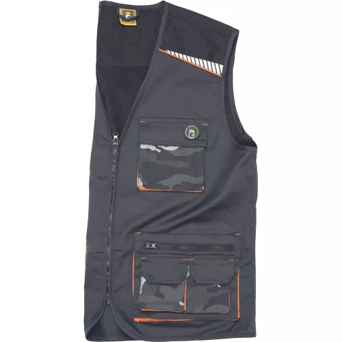 • Férfi munkamellény rendkívül tartós sztreccs anyagból • elöl cipzárral • multifunkcionális zsebek • Oxford 600D megerősített vállrészek • fényvisszavető elemek