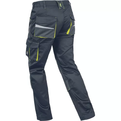 • férfi munkanadrág, rendkívül tartós rugalmas anyagból • elasztikus derékkal • multifunkcionális zsebek • Oxford 600D megerősített térdzsebek térdvédők behelyezéséhez • nyomtatott szegmensekre bontott fényvisszavető részletek • állítható szárhossz