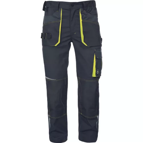 • férfi munkanadrág, rendkívül tartós rugalmas anyagból • elasztikus derékkal • multifunkcionális zsebek • Oxford 600D megerősített térdzsebek térdvédők behelyezéséhez • nyomtatott szegmensekre bontott fényvisszavető részletek • állítható szárhossz