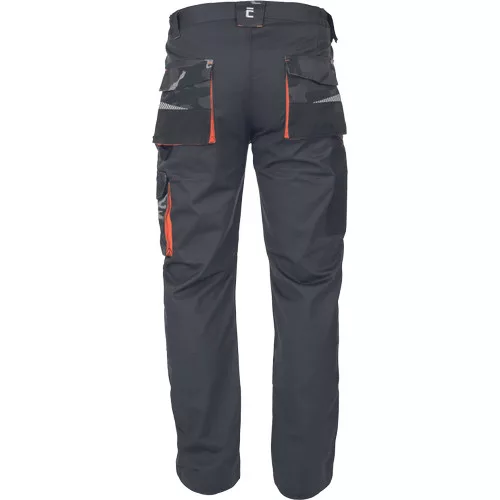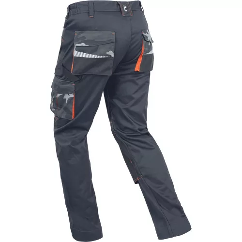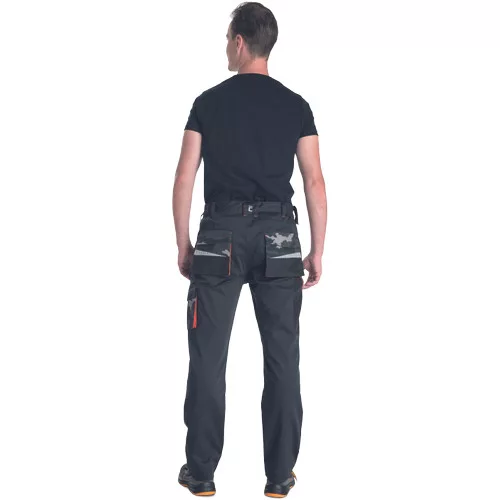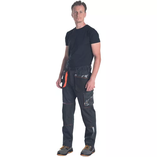 • férfi munkanadrág, rendkívül tartós rugalmas anyagból • elasztikus derékkal • multifunkcionális zsebek • Oxford 600D megerősített térdzsebek térdvédők behelyezéséhez • nyomtatott szegmensekre bontott fényvisszavető részletek • állítható szárhossz