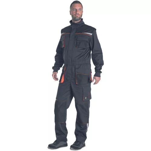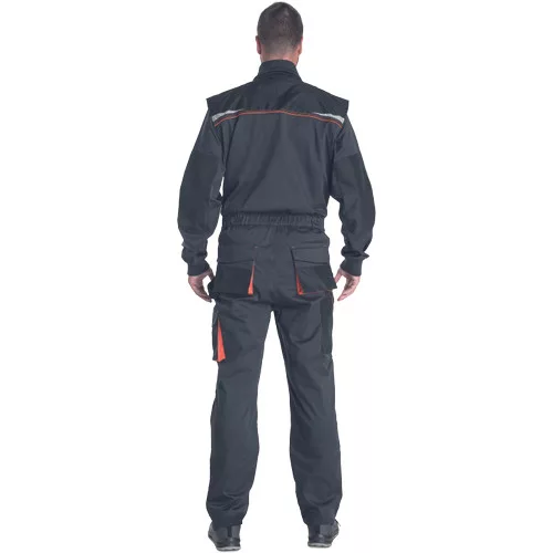• munkaruházat, rendkívül tartós rugalmas anyagból, elasztikus derékkal • elöl cipzárral, védőfedéllel • multifunkcionális zsebek • 2 mellzseb, az egyik mobiltartó zsebbel • Oxford 600D megerősített térdzsebek térdvédők behelyezéséhez • levehető ujjak, kötött elasztikus mandzsettákkal • szegmensekre bontott fényvisszavető részletek • állítható szárhossz