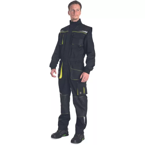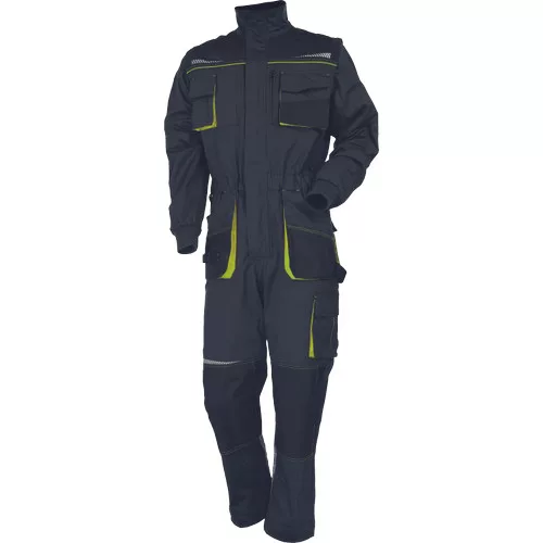 • munkaruházat, rendkívül tartós rugalmas anyagból, elasztikus derékkal • elöl cipzárral, védőfedéllel • multifunkcionális zsebek • 2 mellzseb, az egyik mobiltartó zsebbel • Oxford 600D megerősített térdzsebek térdvédők behelyezéséhez • levehető ujjak, kötött elasztikus mandzsettákkal • szegmensekre bontott fényvisszavető részletek • állítható szárhossz