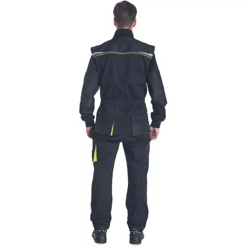 • munkaruházat, rendkívül tartós rugalmas anyagból, elasztikus derékkal • elöl cipzárral, védőfedéllel • multifunkcionális zsebek • 2 mellzseb, az egyik mobiltartó zsebbel • Oxford 600D megerősített térdzsebek térdvédők behelyezéséhez • levehető ujjak, kötött elasztikus mandzsettákkal • szegmensekre bontott fényvisszavető részletek • állítható szárhossz