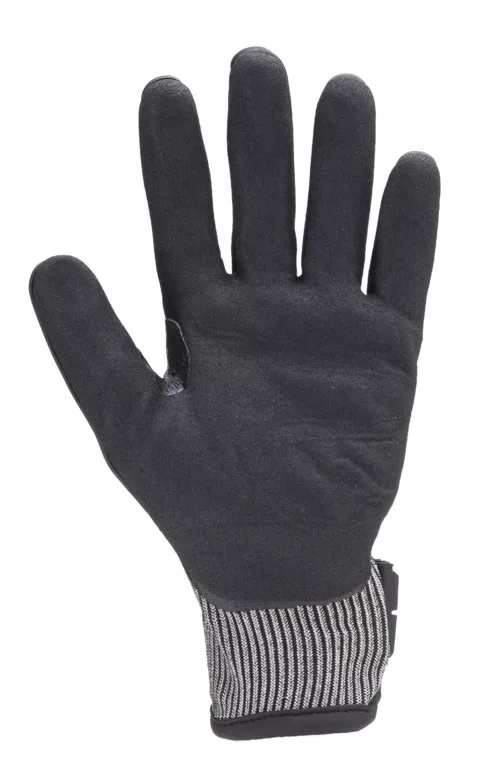 Szürke, varrás nélküli 13-mas kötésű kesztyű, HDPE-vel, elasztánnal erősítve. Duplán mártva nitrillel: az ökölcsont és az ujjak sima, a tenyeren érdesített nitril felülettel. A mutató és hüvelykujj között nitrillel erősítve, tépőzárral állítható mandzsetta