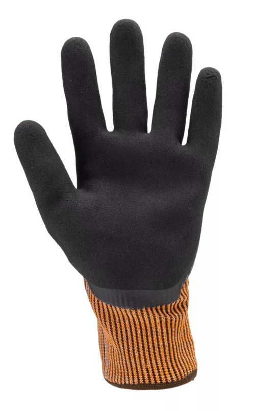 Narancssárga varrás nélküli 13-mas kötésű kesztyű HDPE-vel, poliészterrel és elasztánnal erősítve.Duplán mártott, ökölcsontig sima latex mártás, fekete latex hab tenyérrész.Ergonómikus kialakításKötött mandzsetta