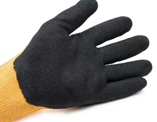 EUROHEAT DEX kesztyű, narancssárga varrat nélküli kötött, 10-es, poliészter és aramid alap, hurkolt belső, homokos felületű nitril tenyérbevonat, kötött csukló.
