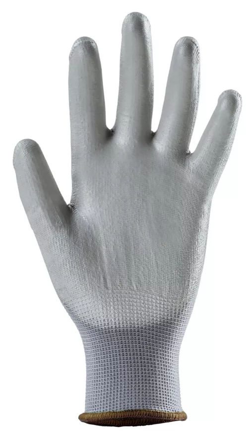 Szürke, varrás nélküli, poliészterrel erősített, 13-mas kötésű kesztyű, szürke poliuretánnal mártott tenyérrel és kötött mandzsettával