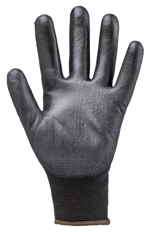 Fekete, varrás nélküli, poliészterrel erősített, 13-mas kötésű kesztyű, fekete poliuretánnal mártott tenyérrel és kötött mandzsettával.