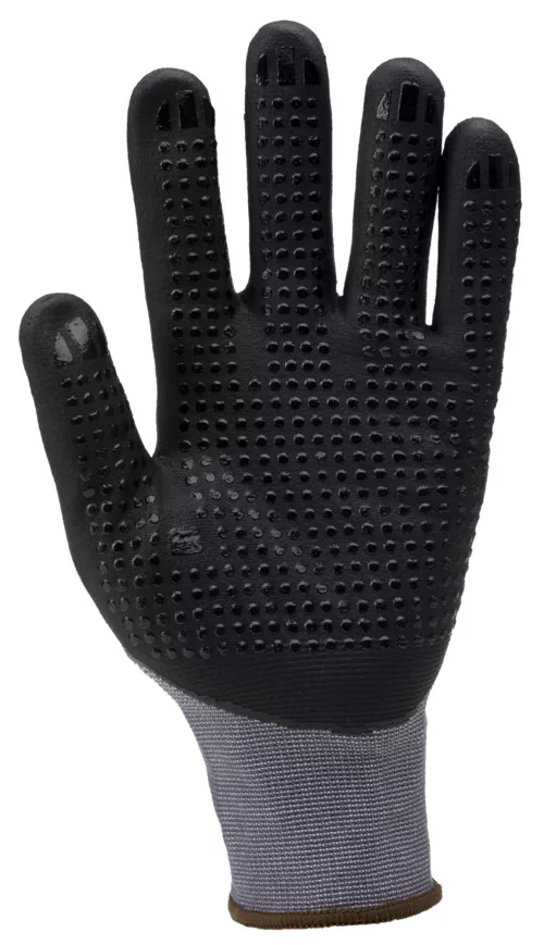 Szürke, varrás nélküli, poliamiddal megerősített, 15-ös kötésű kesztyű, tenyerén nitril mikro-habbal és pettyezve, kötött mandzsettával.A tenyér nitril alapanyagának köszönhetően enyhén olajálló tulajdonsággal rendelkezikOEKO-TEX® STANDARD 100 minősítés , CQ 1301/1, IFTH vagy 15.HCN.70502, HOHENSTEIN