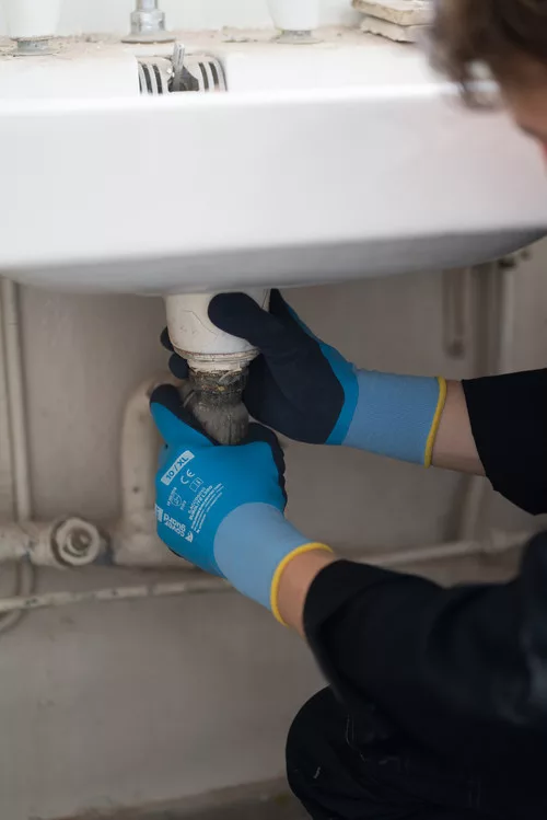Világoskék, varrás nélküli, poliamiddal megerősített kesztyű , kötött madzsentával.Kék latex-szel duplán mártott: Egy sima réteg amely teljesen fedi a kezet, egy másik réteg, amely a tenyeret és az ujjakat védi.