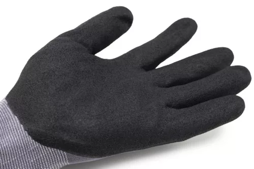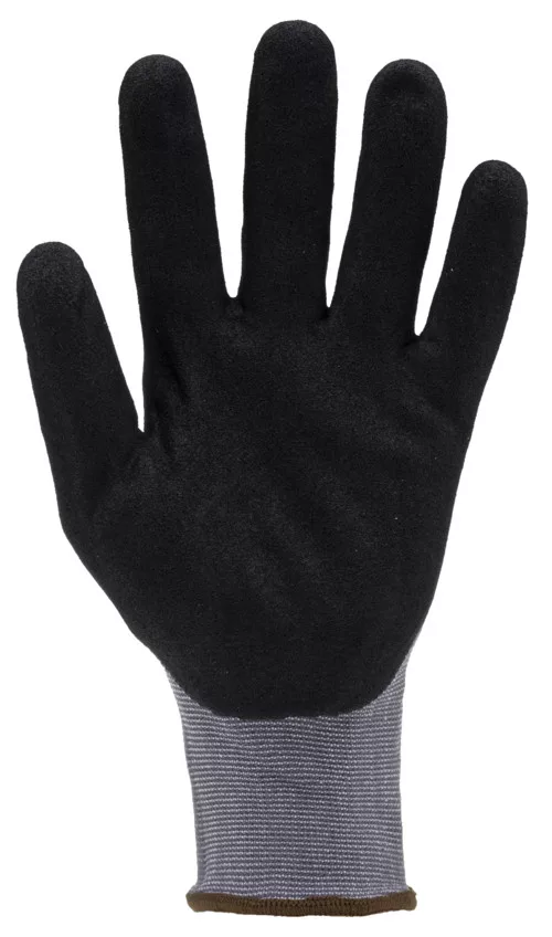 EUROLITE MAX25 kesztyű, 15-ös kötésű szürke poliamid védőkesztyű, tenyérén fekete sandy nitrillel mártva. Kötött, elasztikus mandzsetta,OEKO-TEX® STANDARD 100 minősítés, CQ 1301/1, IFTH vagy SH020 131830, TESTEX