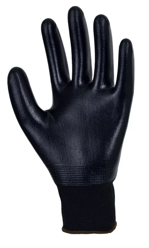 EUROLITE N100 15-ös kötésű, fekete, varrás nélküli poliészter védőkesztyű,Fekete sima nitrillel végig mártva,Kötött mandzsetta