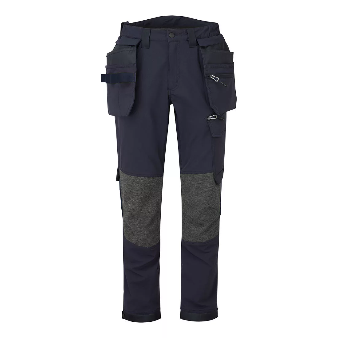 The EV4 Stretch Holster Trouser offers an enhanced ergonomic design, featuring laser cut ventilation for optimal airflow during work. With a high-rise back waistband and side elastication, it provides excellent protection in all working positions. The trousers include pre-bent, side entry adjustable knee pad pockets, spacious front pockets, and versatile zip thigh pockets for secure storage of phones, pens, and tools. Triple stitching throughout ensures maximum durability.