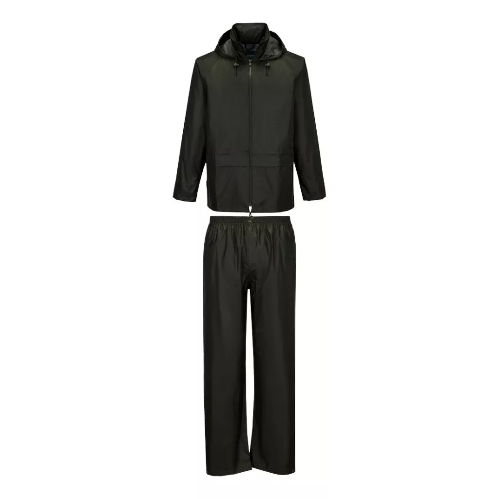 The Essentials Rainsuit offers excellent waterproof protection in one convenient set. This great value lightweight classic suit is a must have with its taped seams. Features include 2 pockets at front of Jacket and 2 side access pockets in the trouser, with a pack-away adjustable hood and a back vent for ventilation. The Jacket also has inner elasticated cuffs to prevent water entry and the trouser has a fully elasticated waistband and stud adjustable hem for an easy wear. This suit comes packaged together in one bag that is ideal for retail.